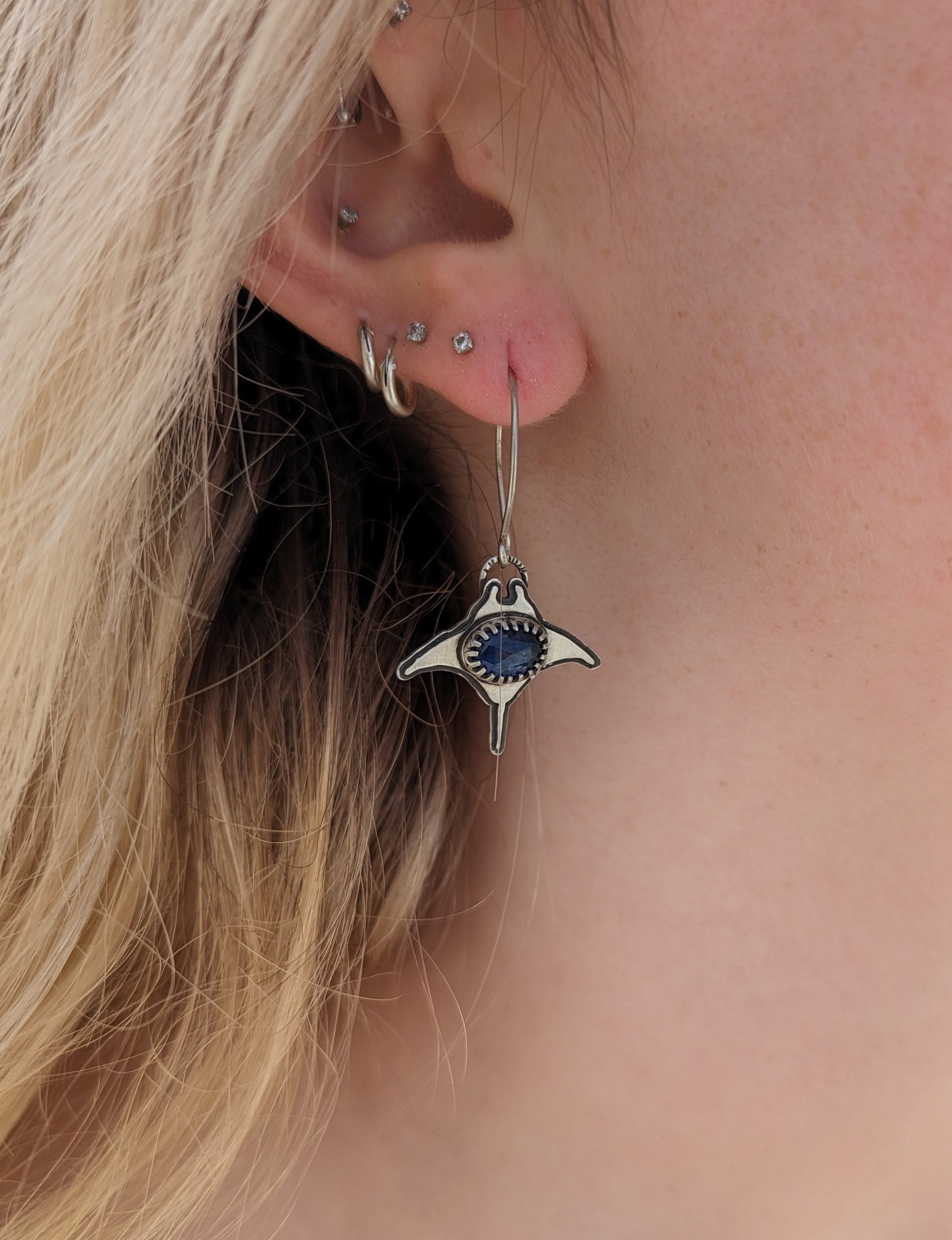 Inspired by the fluid grace of the ocean’s manta ray, these sterling silver earrings reflect balance, freedom, and strength. Each curve mirrors the manta’s effortless movement, symbolizing connection to nature and self. Deep blue kyanite gemstones add contrast and calm energy, grounding the design with modern simplicity. Made for the woman who values authenticity, craftsmanship, and a life shaped by nature’s rhythm.